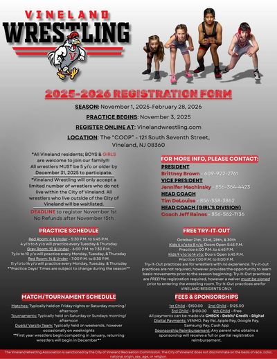 Registrations are open for the 2025-2026 Wrestling Season. Deadline to register is November 1st.